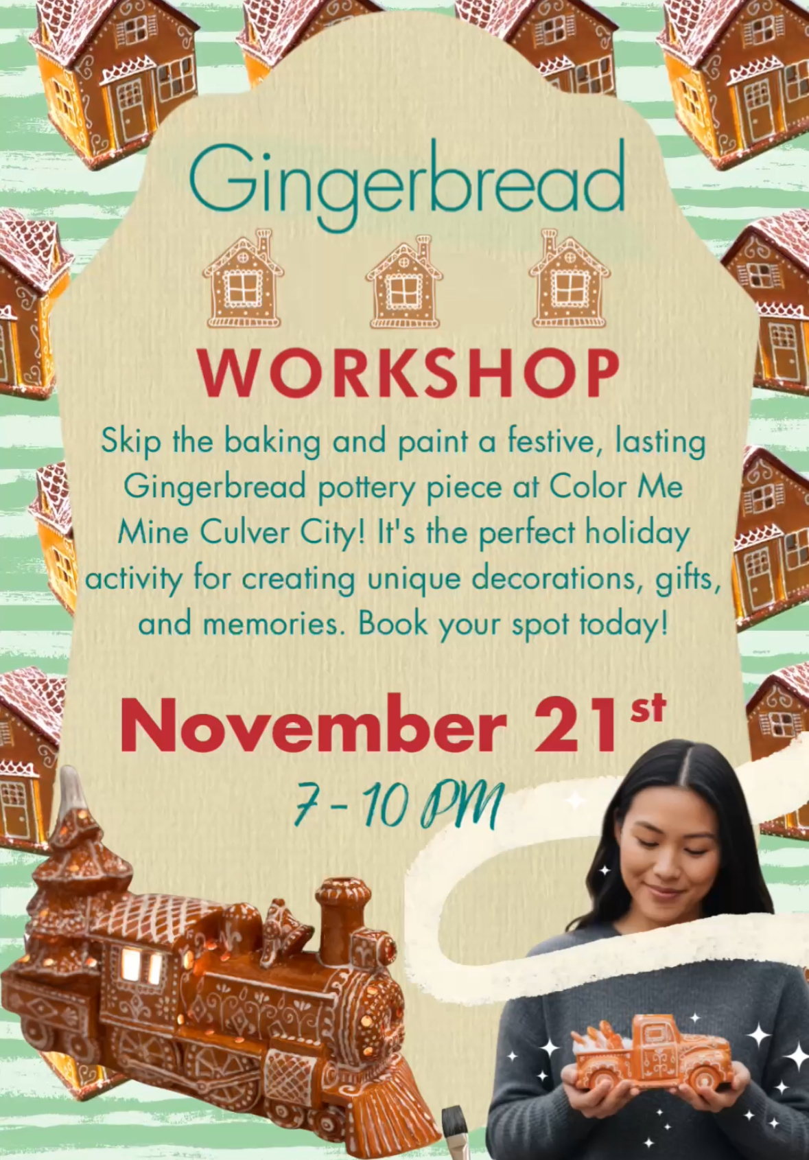 Skip the baking and paint a festive, lasting Gingerbread pottery piece at Color Me Mine Culver City! It’s the perfect holiday activity for creating unique decorations, gifts, and memories. Book your spot today!